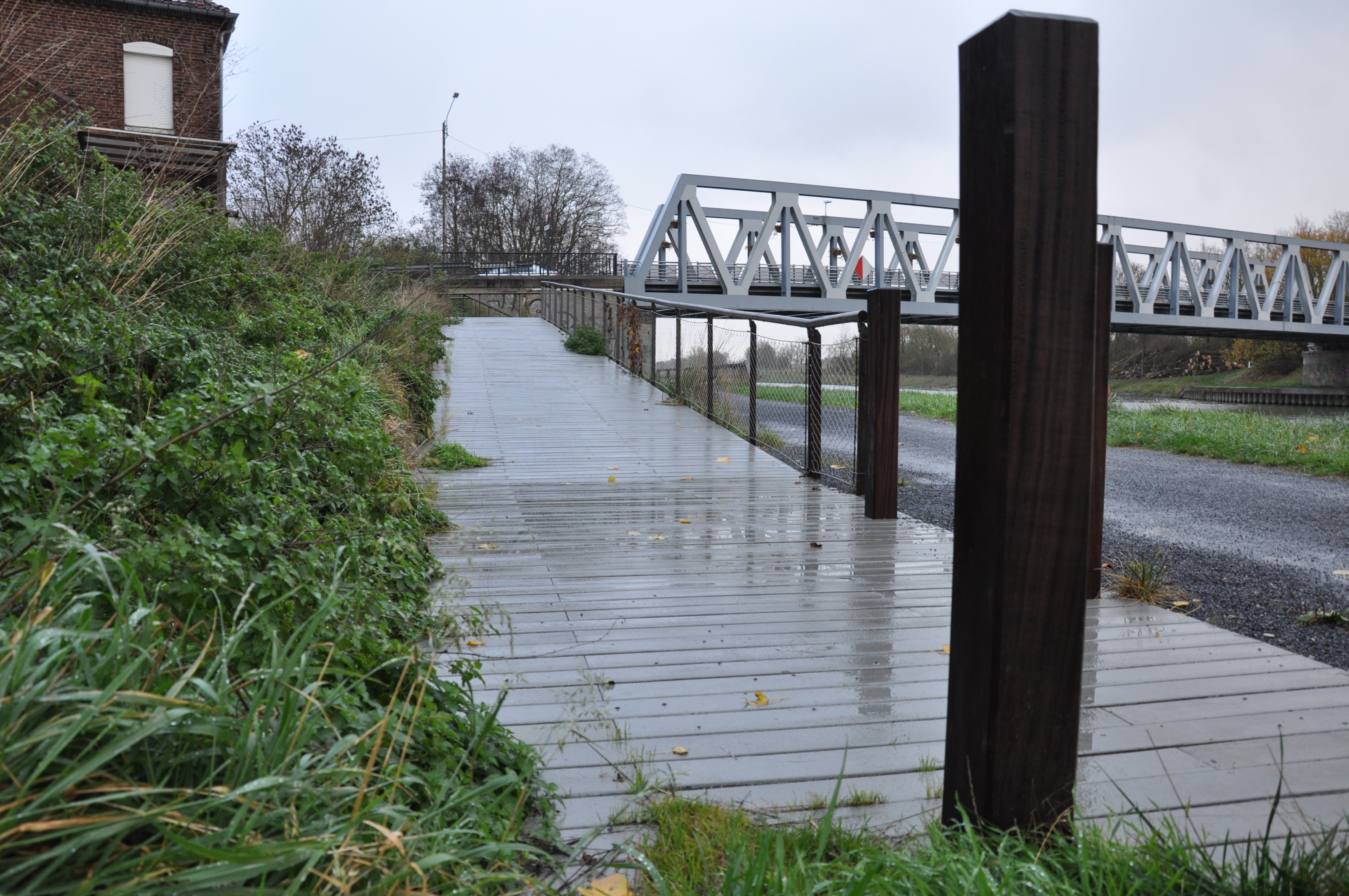 À chaque fois, un panneau pédagogique évoque d’un côté un symbole patrimonial de la Chaîne des Parcs du Pôle métropolitain de l’Artois, et de l’autre un pan d’histoire locale : les Baudets à Hinges, la battellerie à Annezin, le parc des industries Artois-Flandres à Douvrin/Billy-Berlcau, mais aussi les commerces et services situés à proximité. Là où ça le justifie, des passerelles ont été aménagées, et un marquage au sol a été réalisé. Exemple à Violaines, où le centre-bourg est désormais relié au chemin de halage. Pour les glissières, le bois a été privilégié.